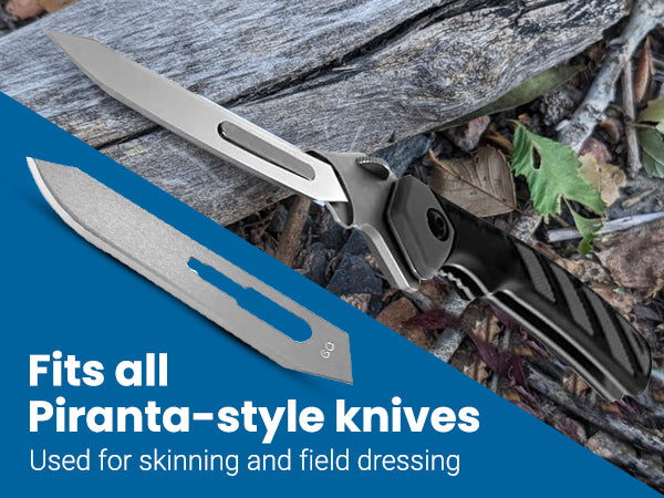 The universal compatibility ensures a perfect fit with Pakcan Medical, MedBlades, Havalon Piranta, and other hunting edge knives, making these Piranta compatible blades a versatile addition to your toolkit. Lightweight yet durable, these blades maintain their sharpness through repeated use, offering exceptional value.