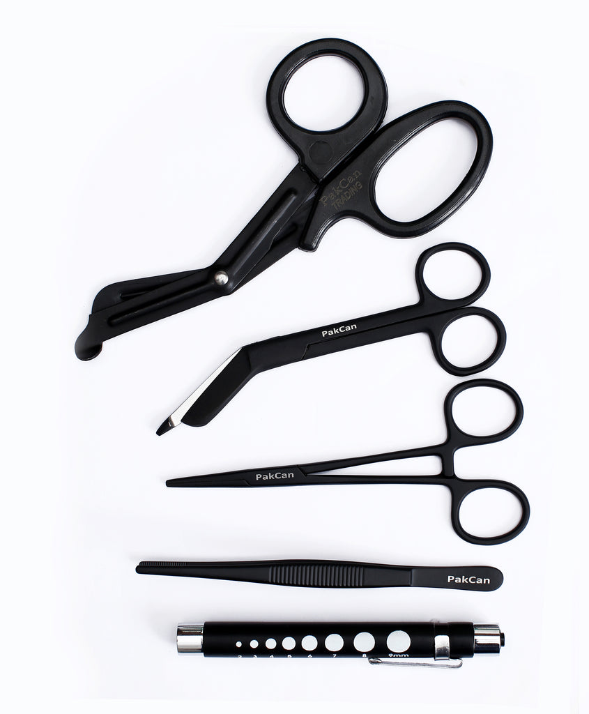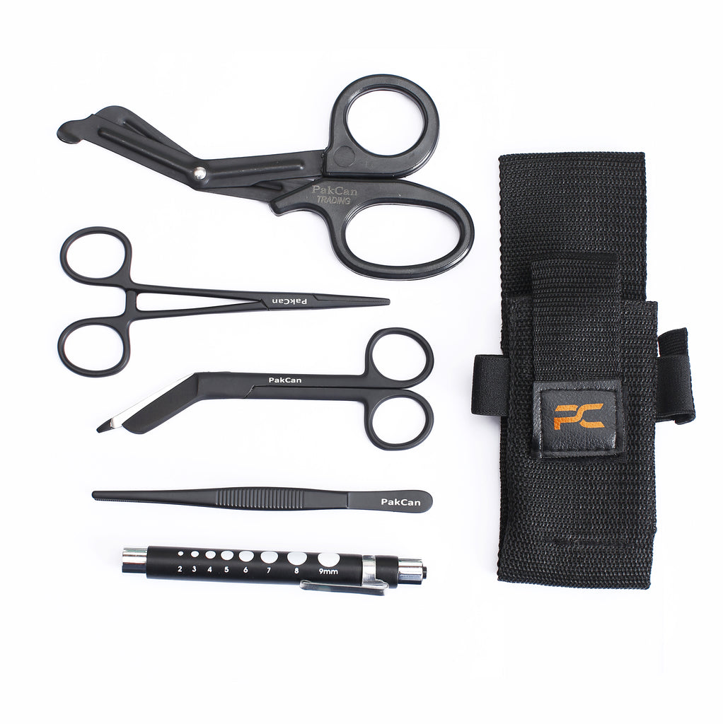- 6-in-1 COMPLETE MULTIPURPOSE KIT: Kit contains Bandage Scissors, EMT Trauma Shears, Hemostat, Pupil Light, and Belt Holster Pouch